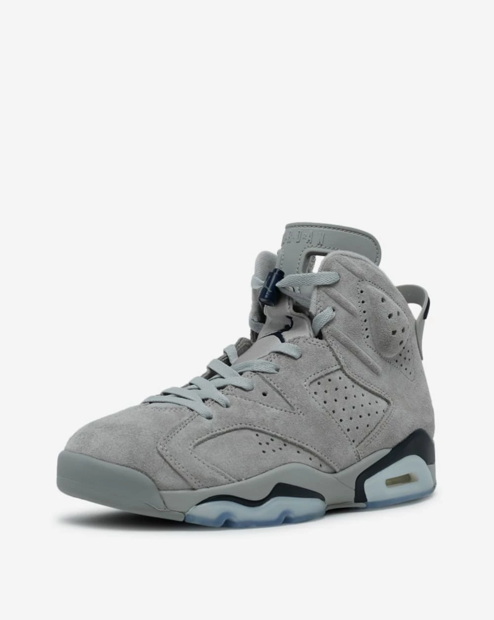Wearing this silhouette when Michael won his first championship, the Jordan 6 quickly rose to stardom as an iconic retro style. The Georgetown colorway takes on a smooth Magnet suede paired with an icy blue translucent sole for added fresh features. College Navy kicks off the accented features on these sneakers for an added pop of color to the monochrome design. Weather you’re stepping out in style or planning on a pick up street game, an added bounce lets you know that comfort comes no matter where you need it.