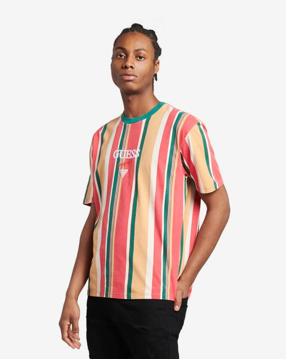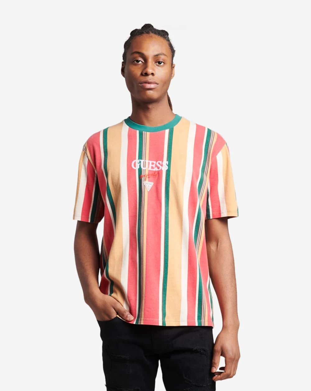 Upgrade your look with this striped tee from GUESS. This lightweight cotton T-shirt features GUESS Originals embroidery for a distinctly ’90s look.