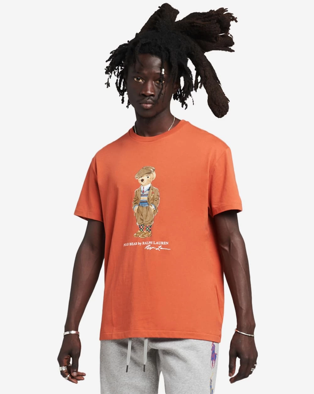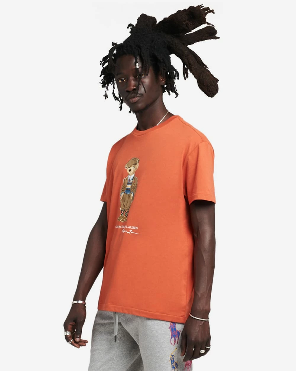 On this cotton T-shirt, the iconic Polo Bear contrasts a polished blazer and cricket sweater with rugged patchwork jeans.
