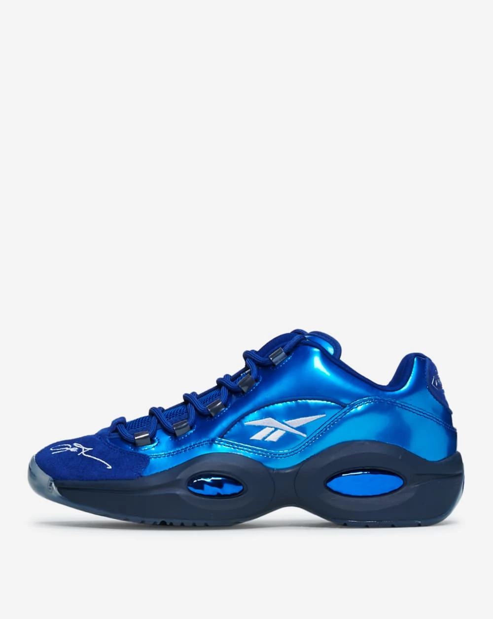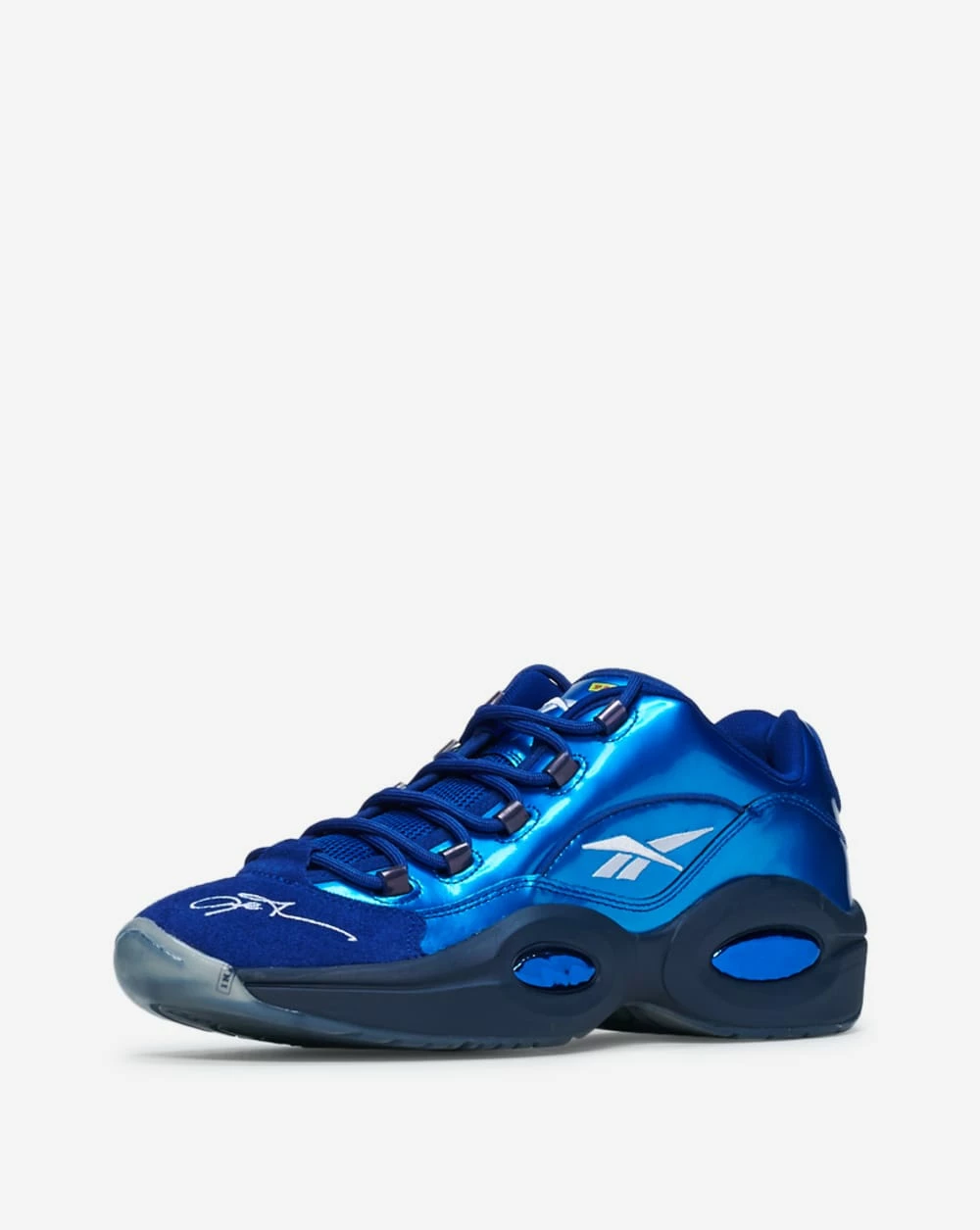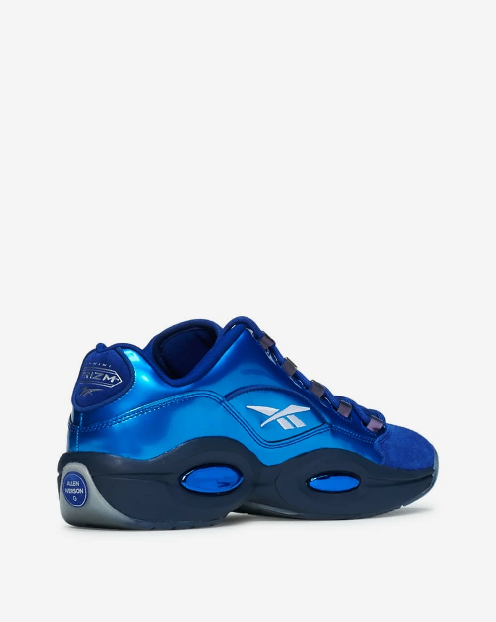 Entering the NBA after two seasons at Georgetown, A.I.s short stature didnt stop him from dominating a league of giants. Helping him weave through the competition his first year were his iconic Question Low Reeboks. Crisp white tumble leather uppers catch the eye while Hexalite Cushioning softens each stride. Stepping over competition with the eye-popping, pearl-like, navy leather while Reebok spelled down through the eyelets let them know who you rep. Released from the Reebok archived for the first time since 2016, this silhouette belongs in any sneakerheads arsenal.