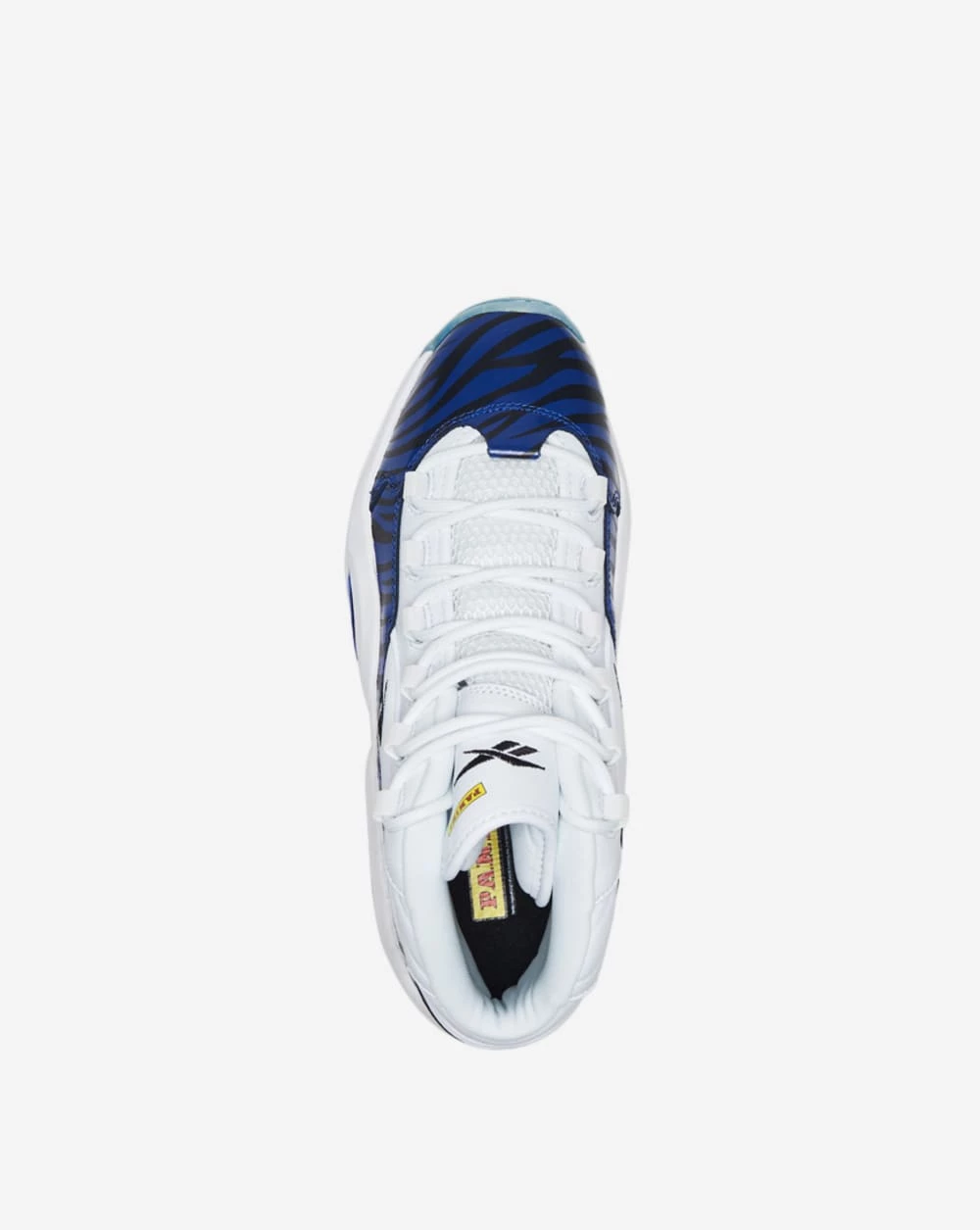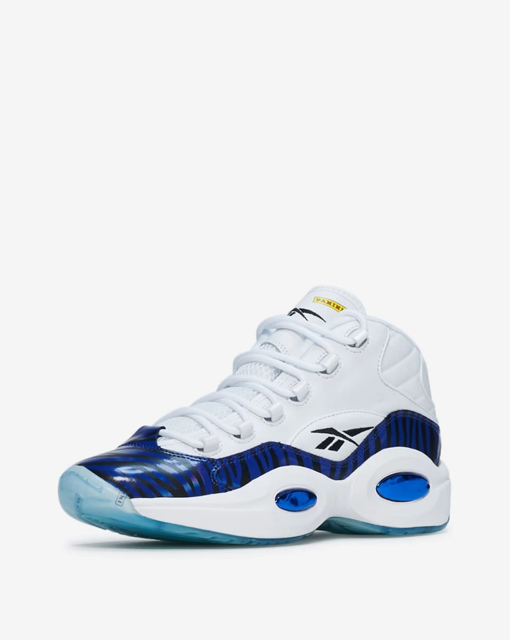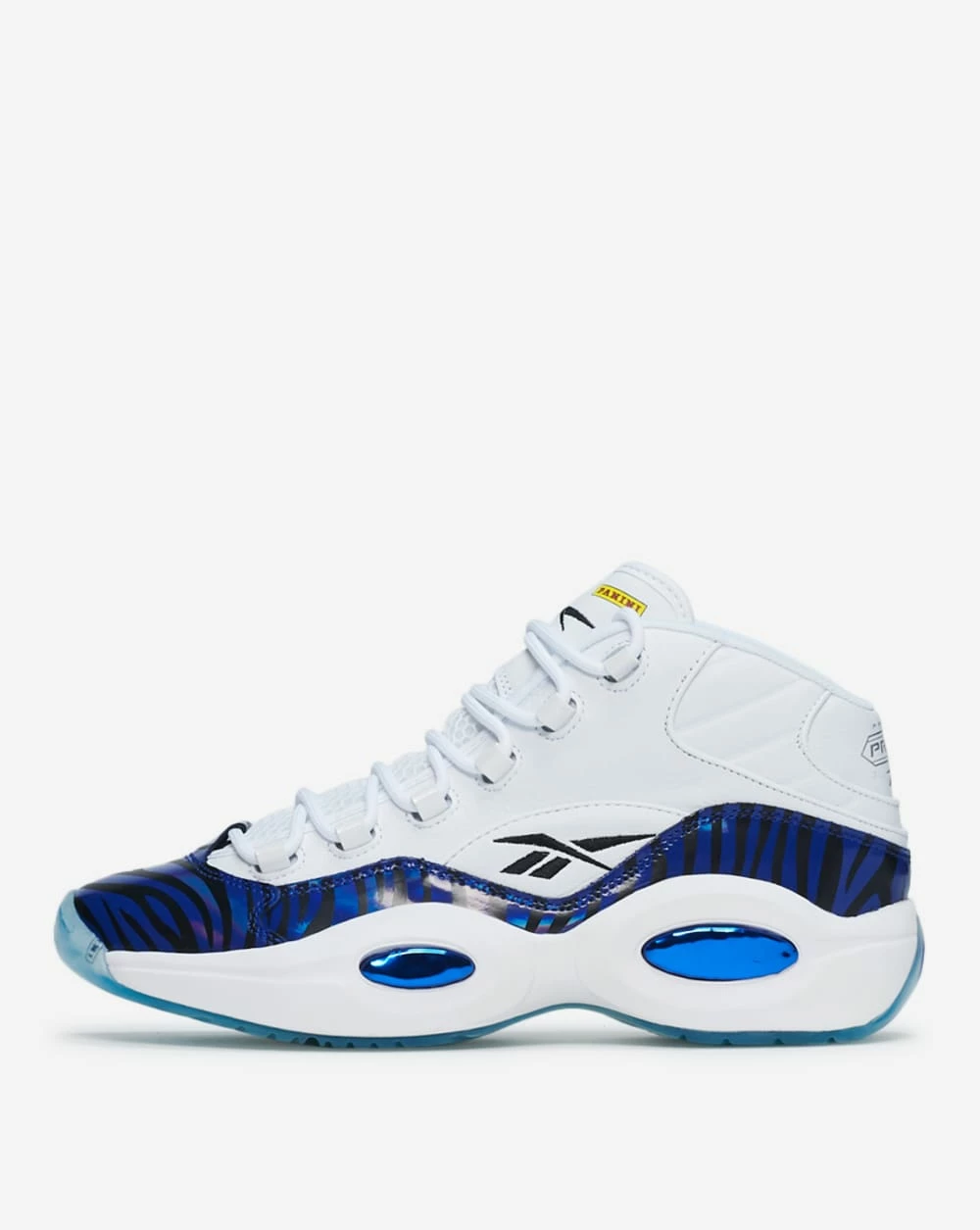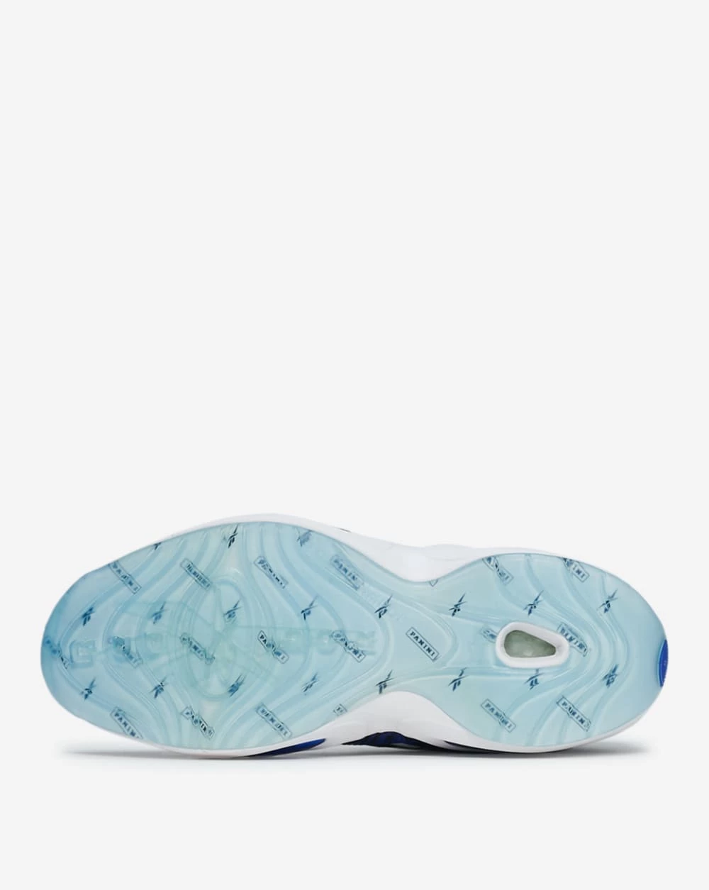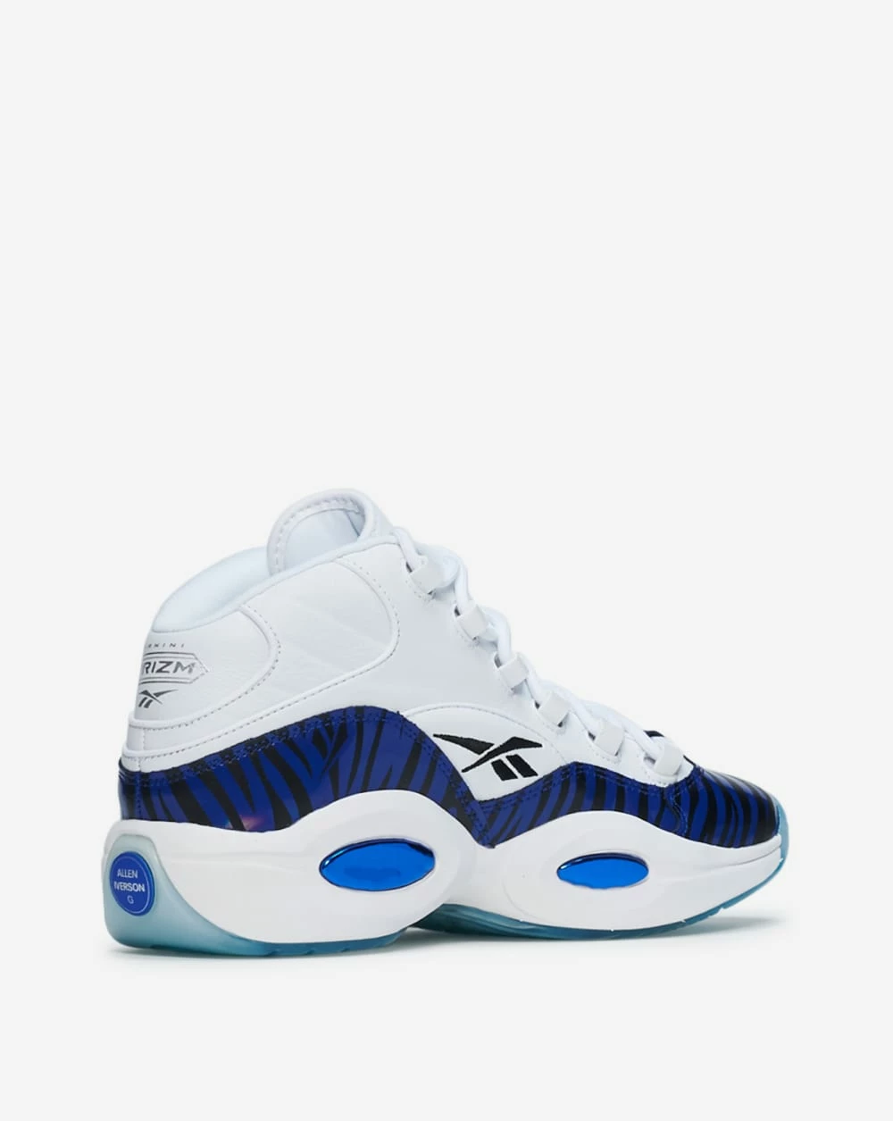 Entering the NBA after two seasons at Georgetown, A.I.s short stature didnt stop him from dominating a league of giants. Helping him weave through the competition his first year were his iconic Question Mid Reeboks. Crisp white tumble leather uppers catch the eye while Hexalite Cushioning softens each stride. Stepping over competition with the eye-popping, pearl-like, blue leather while Reebok spelled down through the eyelets let them know who you rep. Released from the Reebok archived for the first time since 2016, this silhouette belongs in any sneakerheads arsenal.